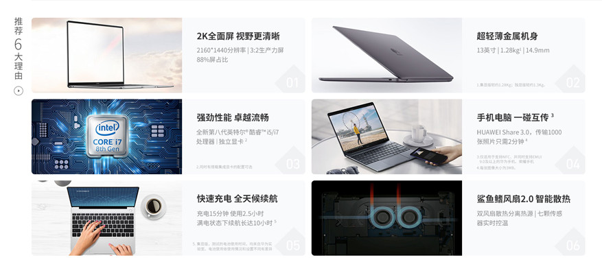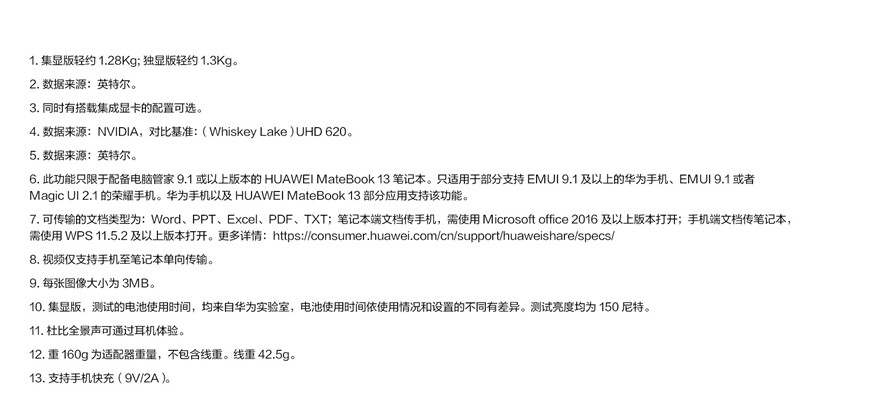 HUAWEI MateBook 13 主機(jī) X 1HUAWEI USB-C 電源適配器65W X 1電源適配器線(USB-C) X 1USB-C 轉(zhuǎn) USB-A 轉(zhuǎn)接線 X 1快速入門 X 1保修卡 X 1Huawei Share 3.0 一碰傳快速入門 X 1S/N三聯(lián)貼標(biāo)簽 X 1